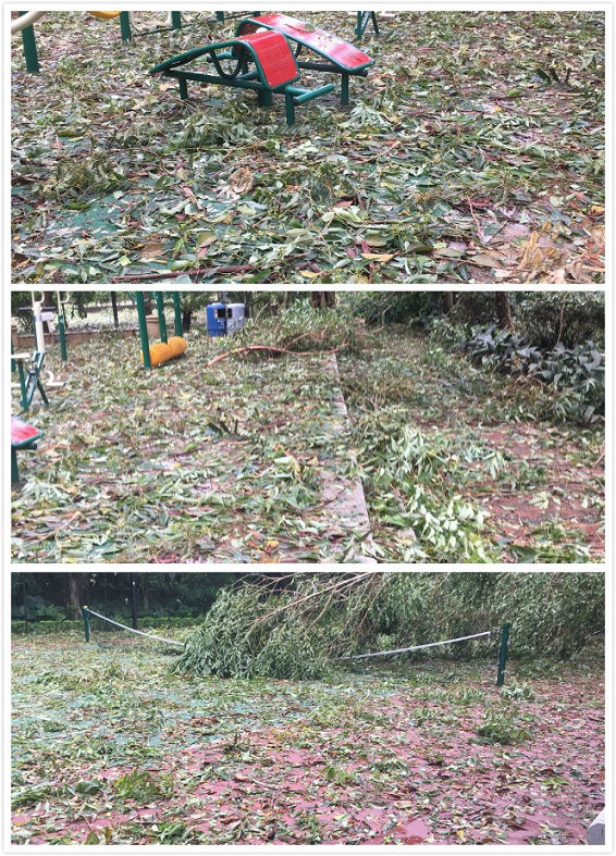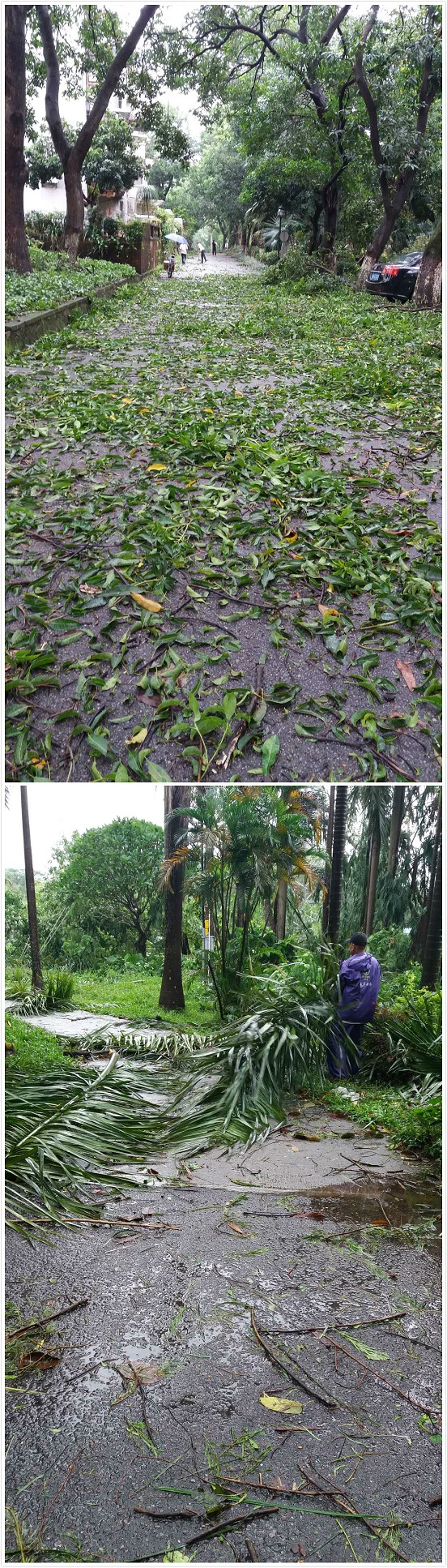 臺(tái)風(fēng)過境后路面上滿地的落葉垃圾以及斷落的樹枝。